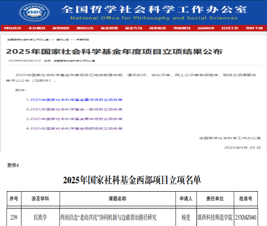 近日,全国哲学社会科学工作办公室公布了2025年国家社会科学基金年度项目立项名单,我院杨斐副教授主持的《西南沿边“老幼共托”协同机制与边疆善治路径研究》成功获批西部项目(民族学)立项。标志着我院在国家社科基金项目申报工作中实现了零的突破,充分彰显了学院在民族学与边疆治理研究领域的学术实力。